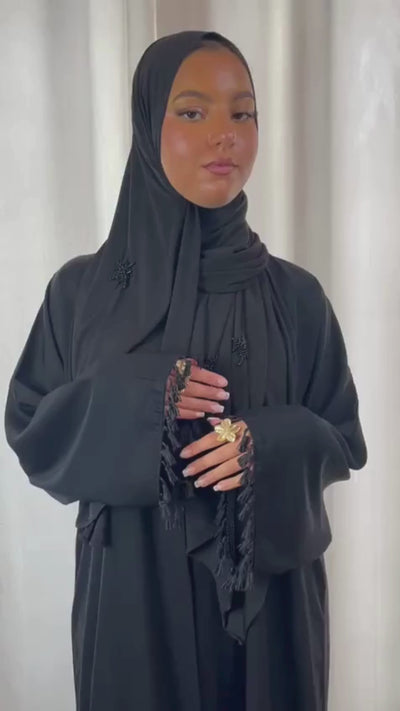 De Lila abaya betovert met zijn verfijnde eenvoud en delicate kwastjes die een vleugje zachtheid en originaliteit toevoegen. Gemaakt van een lichte en soepele stof, is hij ideaal voor een comfortabele alledaagse look zonder concessies te doen aan stijl.